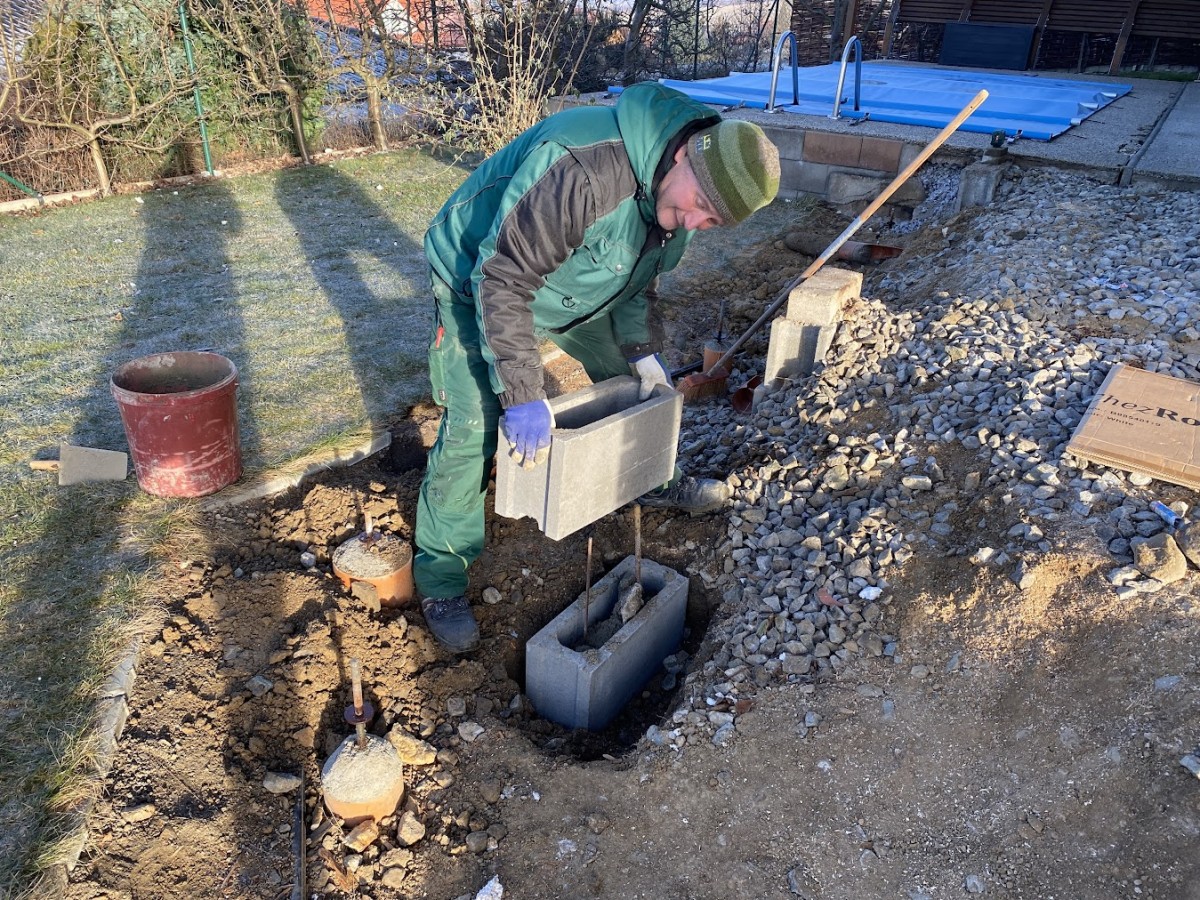 Kvůli svažitému terénu bylo nutné betonovat nové patky a pečlivě vyrovnat podklad