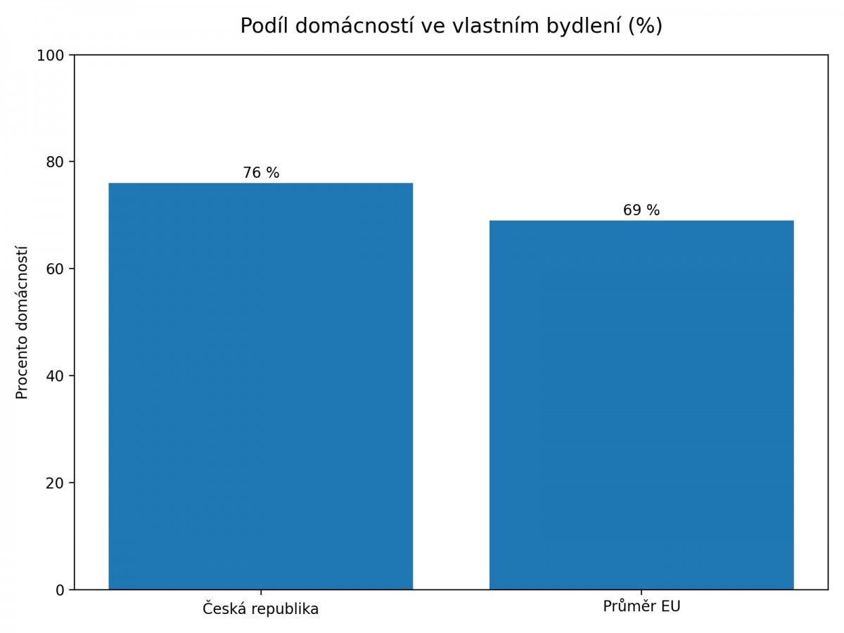 Graf ukazuje podíl domácností bydlících ve vlastním bydlení v České republice ve srovnání s průměrem EU. Údaje vycházejí z dat Eurostatu a slouží k orientačnímu srovnání