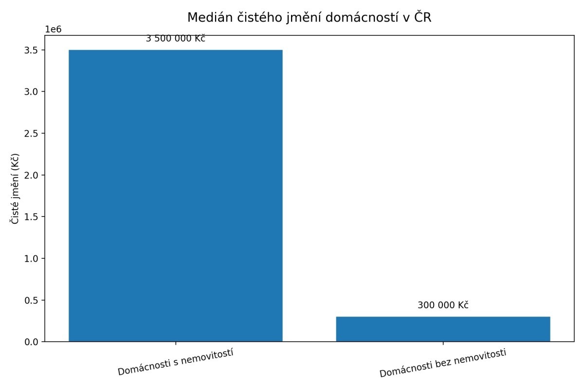 Graf porovnává medián čistého jmění domácností s vlastní nemovitostí a bez ní. Ukazuje výrazný rozdíl mezi oběma skupinami a naznačuje, že vlastnictví bydlení je klíčovým faktorem majetkové nerovnosti