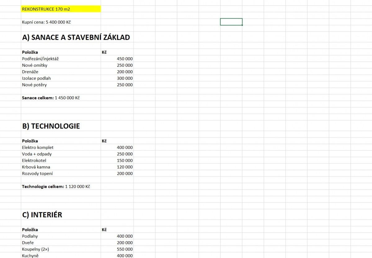 Z tabulky, kde manželé porovnávali rozpočet na novostavbu a rekonstrukci, je zjevné, že největší položkou by byla samotná koupě objektu