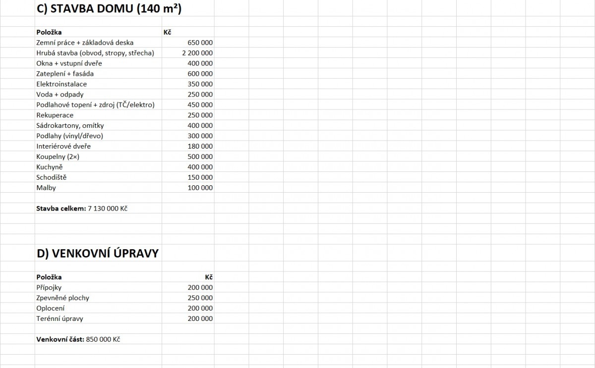 Z tabulky, kde manželé porovnávali rozpočet na novostavbu a rekonstrukci, je zjevné, že největší položkou by byla hrubá konstrukce novostavby