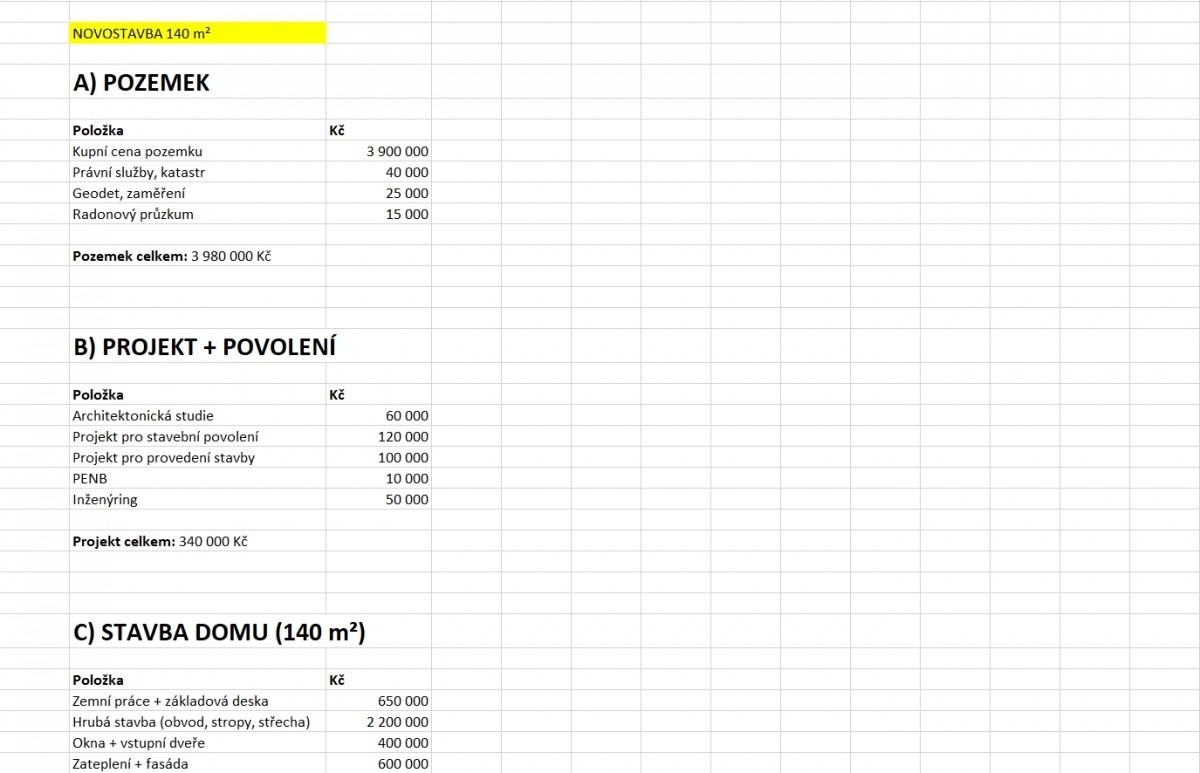 Z tabulky, kde manželé porovnávali rozpočet na novostavbu a rekonstrukci, je zjevné, že velkou položkou byl samotný stavební pozemek