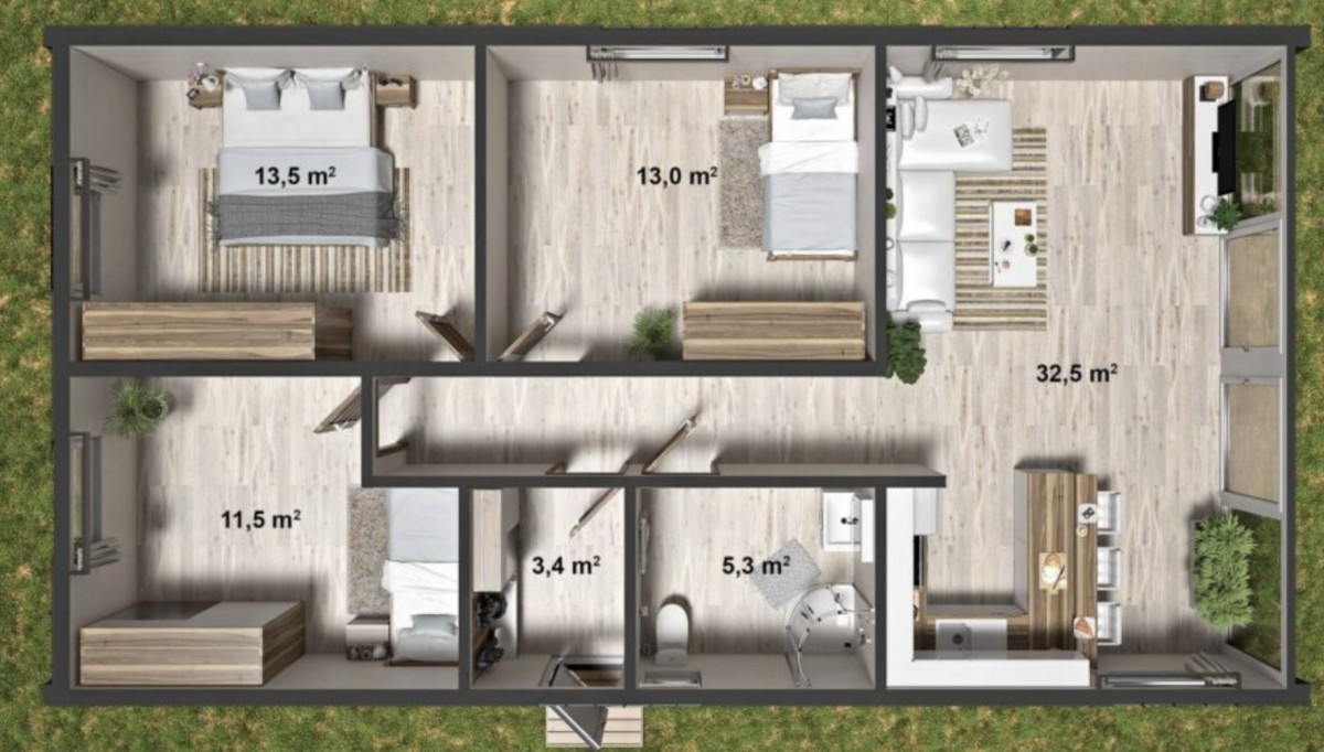 Moderní modulové dřevostavby dnes nabízejí plnohodnotné bydlení pro čtyřčlennou rodinu za cenu, která se ještě před několika lety zdála nereálná. Jeden z takových domů lze pořídit na klíč přibližně za 2,6 milionu korun a přitom nabídne tři ložnice, velký obytný prostor i energeticky úspornou konstrukci. Fotografie interiéru i exteriéru najdete v článku.