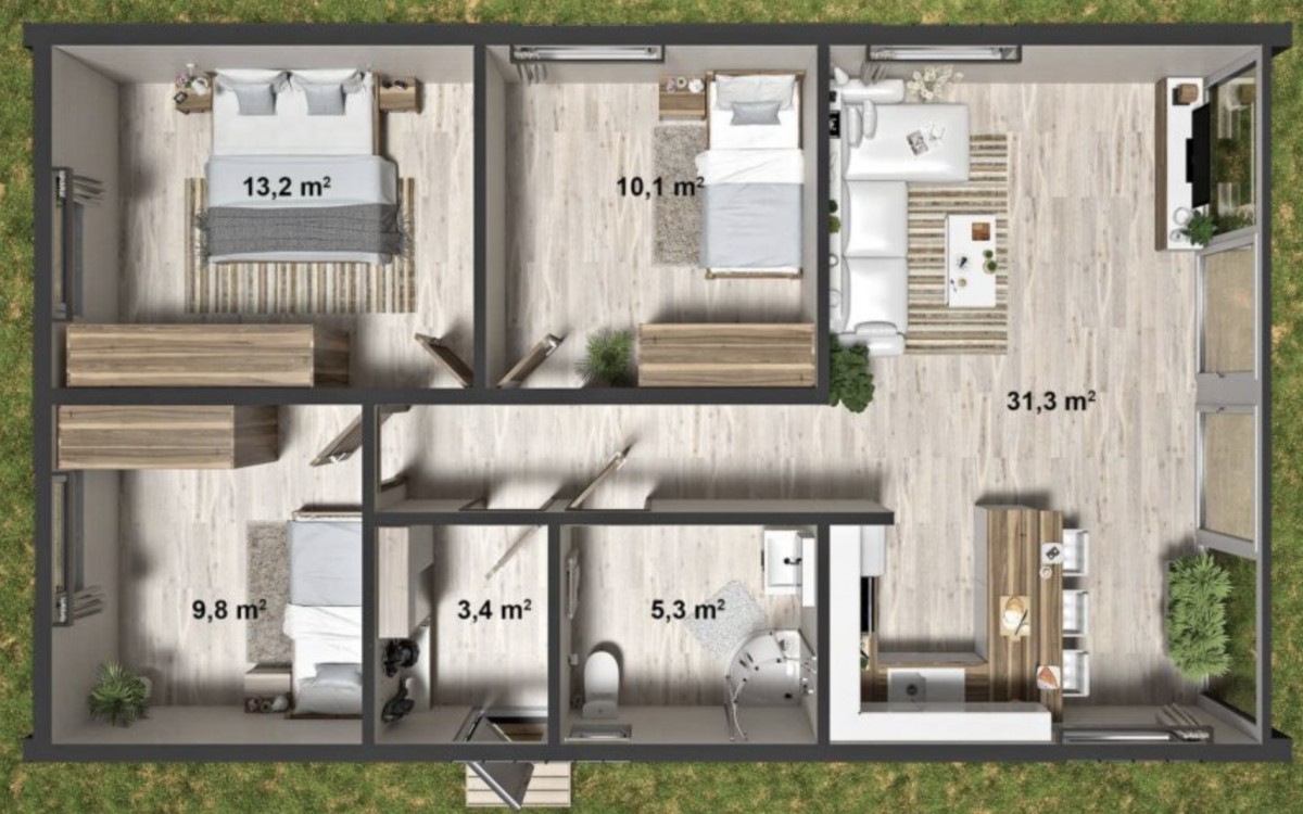 Moderní modulové dřevostavby dnes nabízejí plnohodnotné bydlení pro čtyřčlennou rodinu za cenu, která se ještě před několika lety zdála nereálná. Jeden z takových domů lze pořídit na klíč přibližně za 2,6 milionu korun a přitom nabídne tři ložnice, velký obytný prostor i energeticky úspornou konstrukci. Fotografie interiéru i exteriéru najdete v článku.