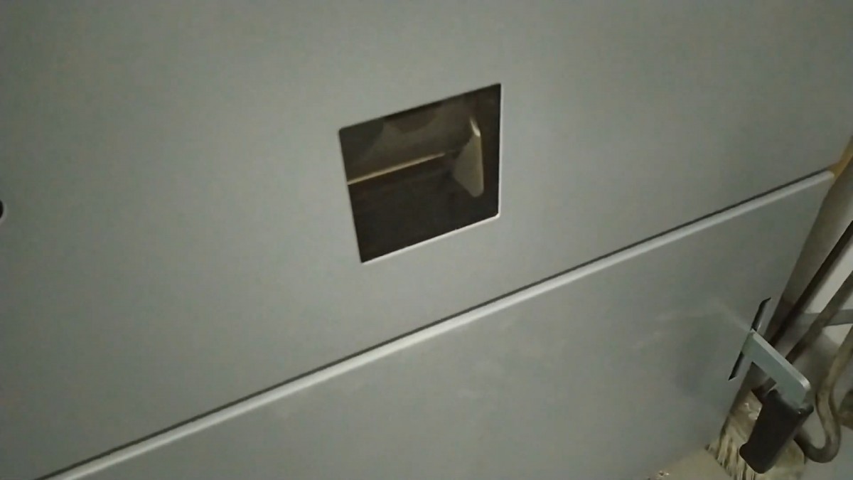 Pohled na spodní dvířka spalovací komory. Průzorem zatím není vidět plamen, proces zplyňování se teprve startuje.