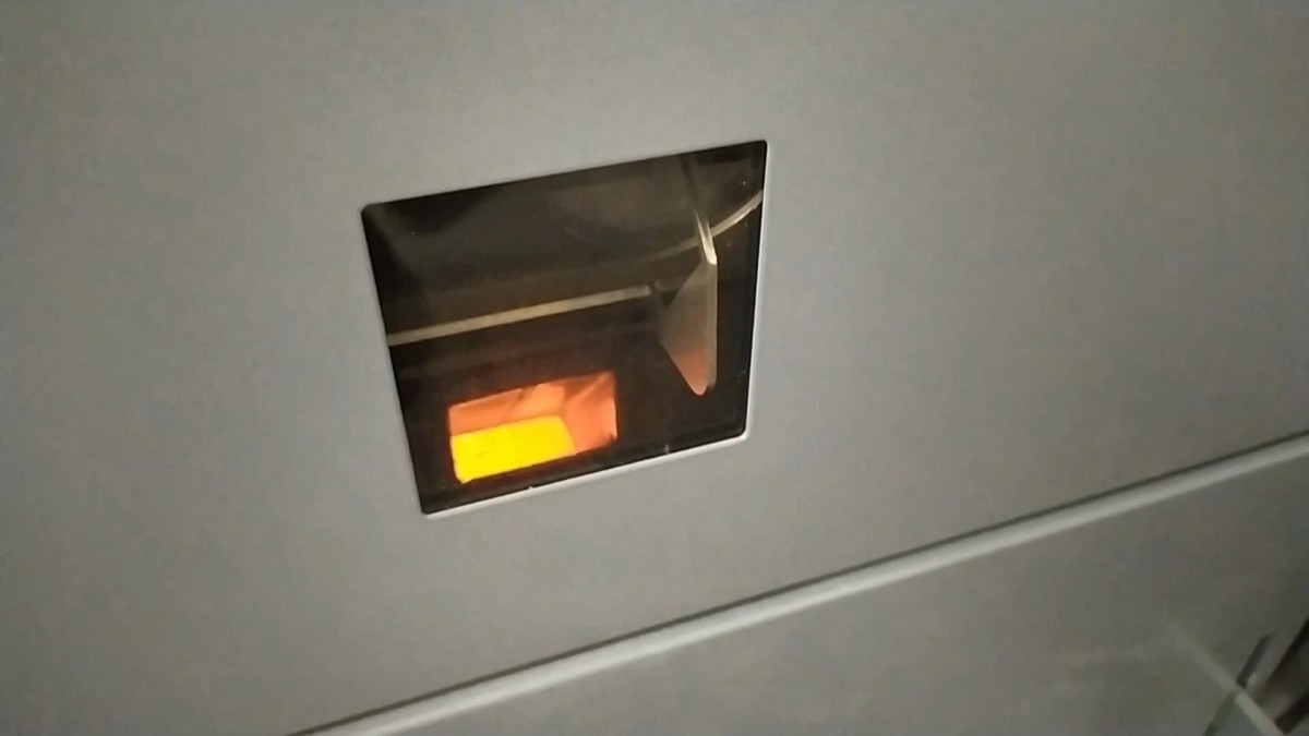 Skrz průzor spodních dvířek je jasně vidět intenzivní plamen. Dřevoplyn z horní komory se zde mísí se vzduchem a hoří.