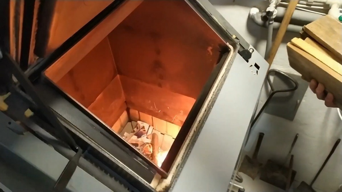 Otevření vrchních dvířek pro hlavní přiložení. V komoře je krásně vidět mohutná vrstva žhavých uhlíků ideální pro velká polena.
