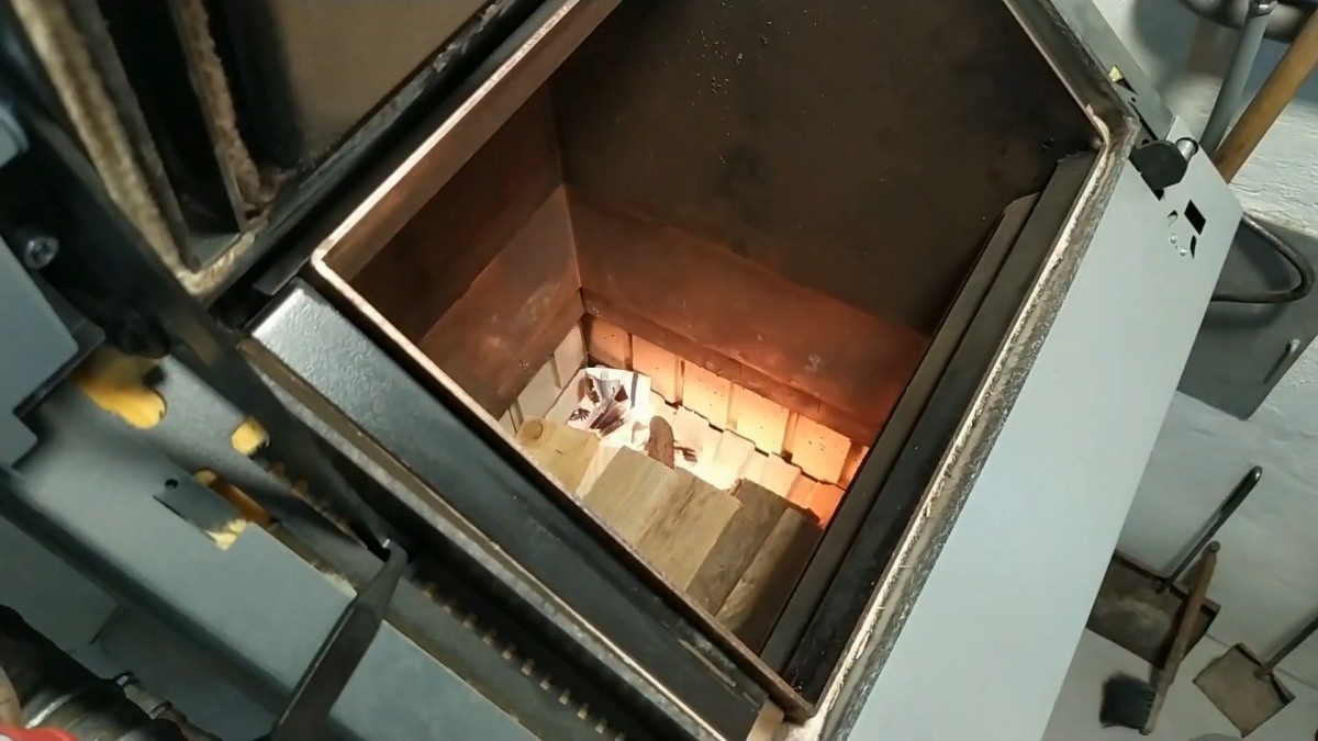 Pokračuje plnění komory velkými kusy paliva. Polena se skládají těsně k sobě, aby odhořívání probíhalo plynule a dlouho.