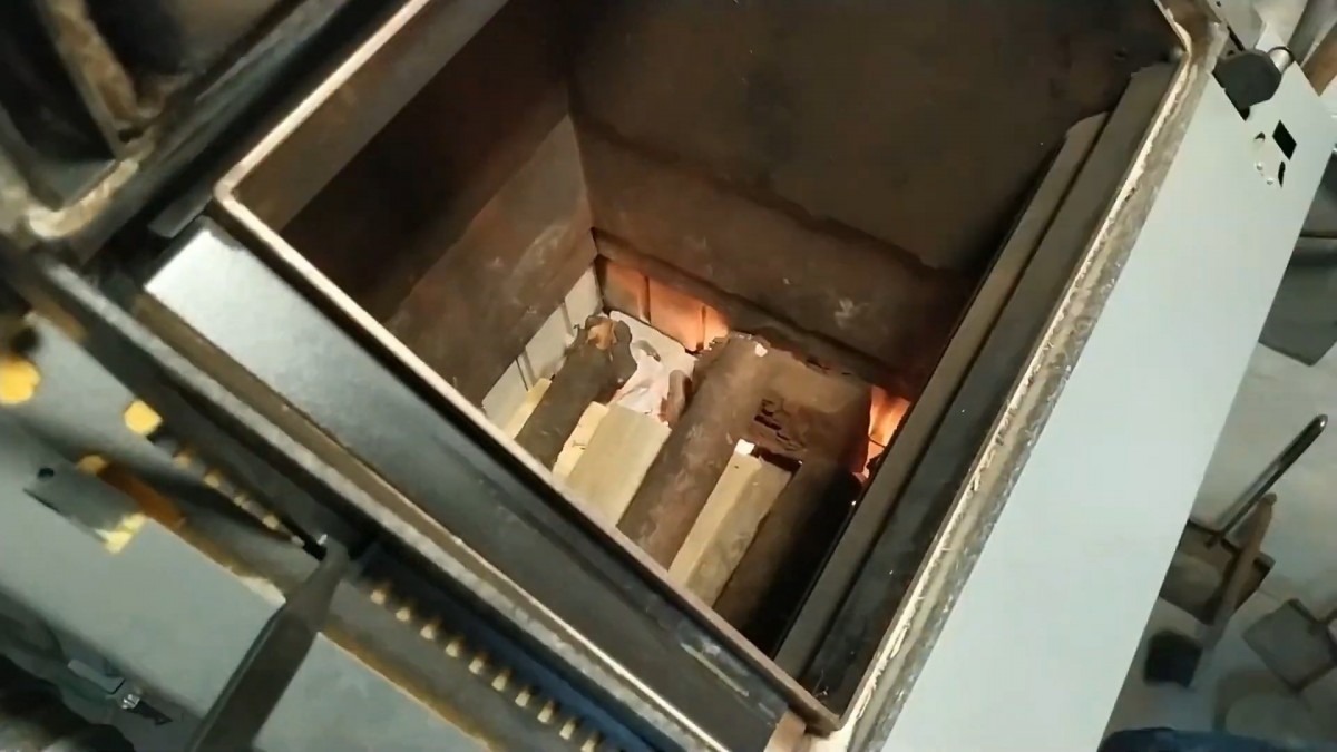 Dřevo je téměř naskládáno. Silný odtahový ventilátor zajišťuje, že kouř při otevřených dvířkách neuniká do místnosti.