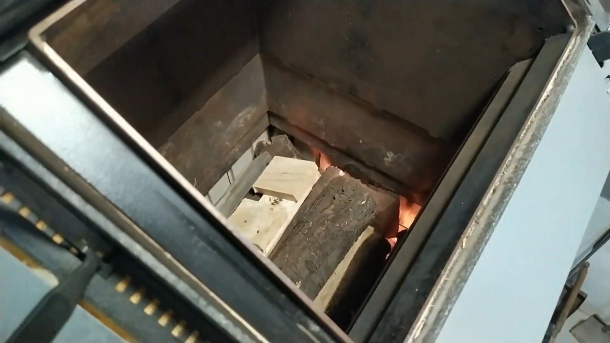 Komora je nyní zcela plná kvalitního kusového dřeva. Polena leží na žhavém základu a brzy z nich začne unikat dřevoplyn.