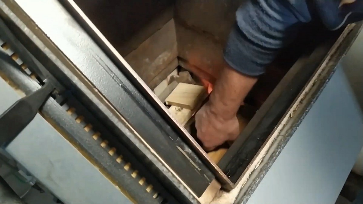 Finální úprava a kontrola uloženého dřeva před definitivním uzavřením kotle. Správné uložení ovlivňuje kvalitu zplyňování.