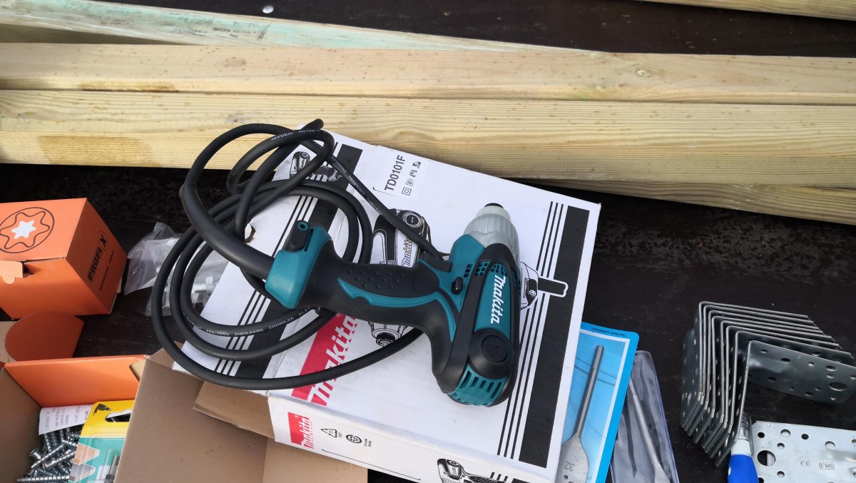 Nářadí bylo základní: elektrický šroubovák, vodováha, pila, svazek šroubů, kovové závity na upevnění konstrukce k korbě přívěsu