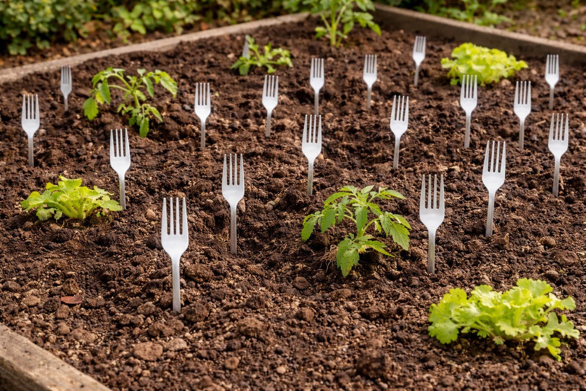 Plastové vidličky zapíchané mezi sazenice vytvářejí jednoduchou ochrannou bariéru. Kočka si na takovém povrchu jen těžko najde místo k hrabání, a záhon proto raději obejde
