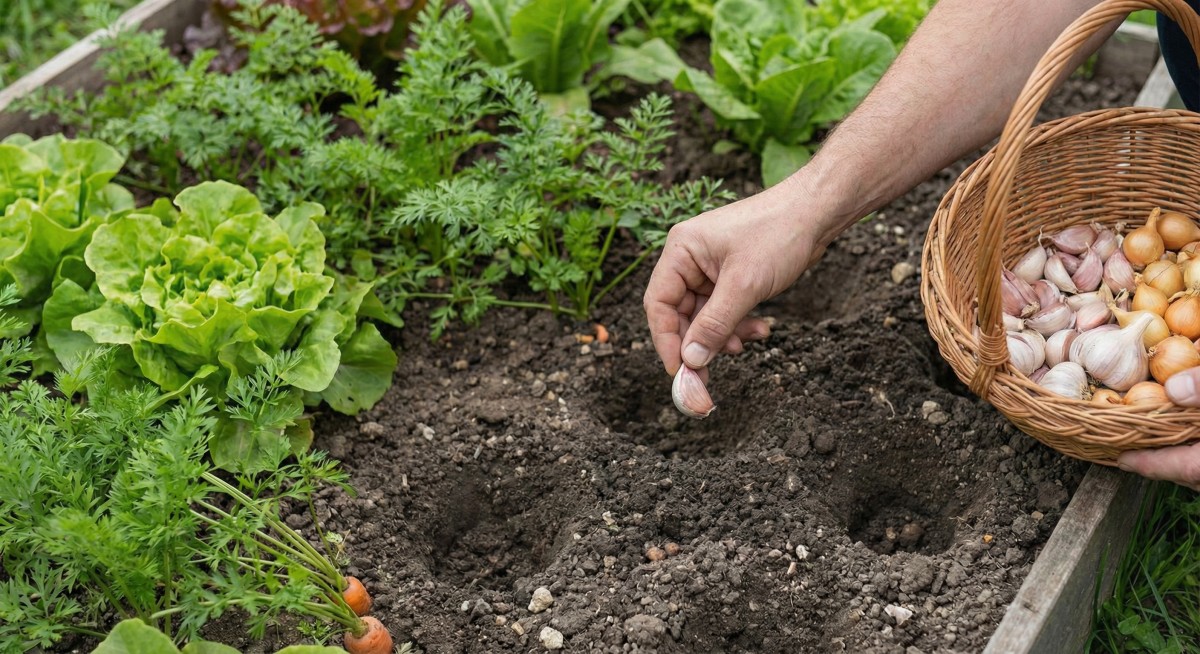 Do každé připravené jamky se opatrně vloží jeden stroužek česneku nebo cibule, špičkou nahoru. Fotografie ukazuje zahradníka, jak vkládá stroužek do jamky