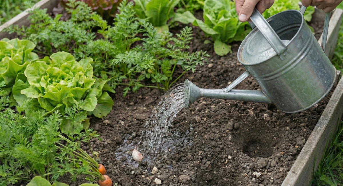 Po výsadbě je nutné nové rostliny zalít. Fotografie ukazuje zahradníka, jak zalévá půdu s nově vysazeným česnekem nebo cibulí