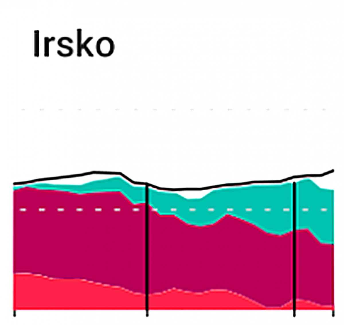 Irsko výrazně omezilo uhlí a zvýšilo podíl obnovitelných zdrojů, fosilní zdroje ale zůstávají významné. Na konci období je spotřeba vyšší než výroba