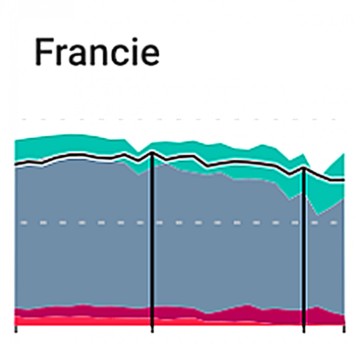 Francie dlouhodobě stojí hlavně na jádru, jehož výroba však v posledních letech kolísá, zatímco obnovitelné zdroje rostou. Na konci období je výroba lehce nad spotřebou