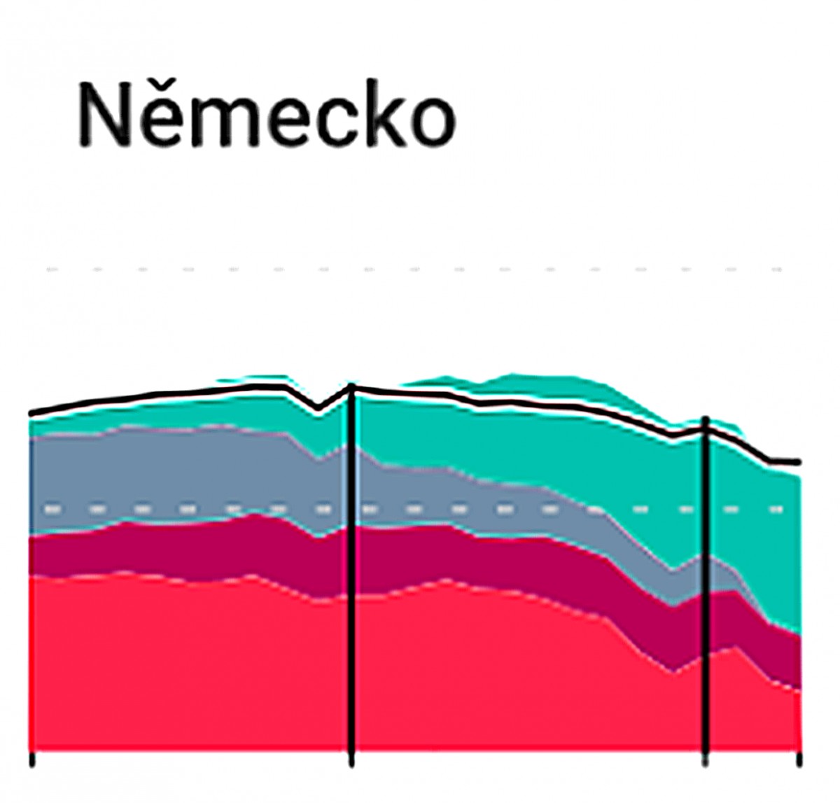 Německo výrazně omezilo jádro i uhlí a rychle zvýšilo podíl obnovitelných zdrojů. Na konci období je výroba lehce pod úrovní spotřeby