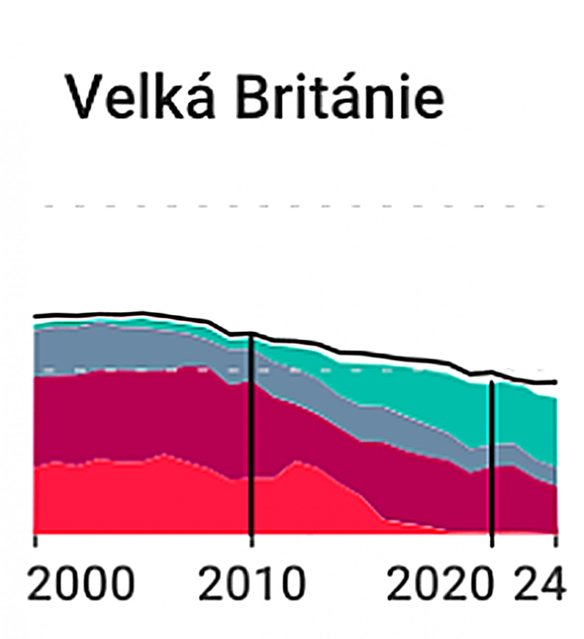 Velká Británie téměř ukončila výrobu z uhlí a výrazně zvýšila podíl obnovitelných zdrojů. Na konci období je výroba mírně pod úrovní spotřeby
