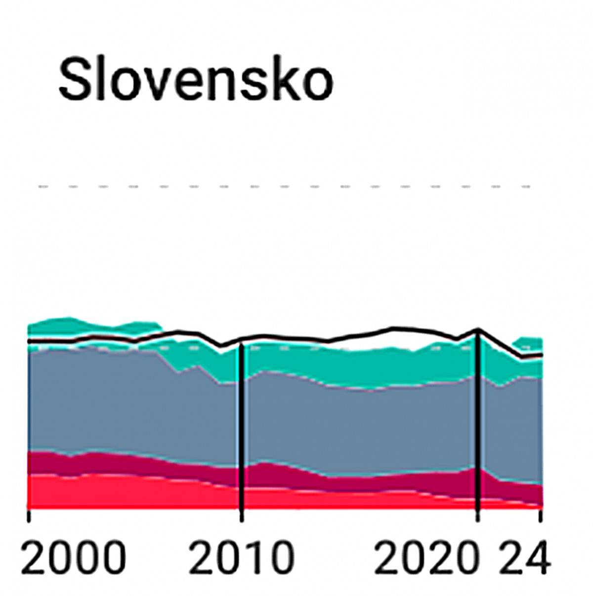 Slovensko dlouhodobě stojí hlavně na jádru, podíl uhlí klesá a obnovitelné zdroje mírně rostou. Na konci období je výroba zhruba vyrovnaná se spotřebou