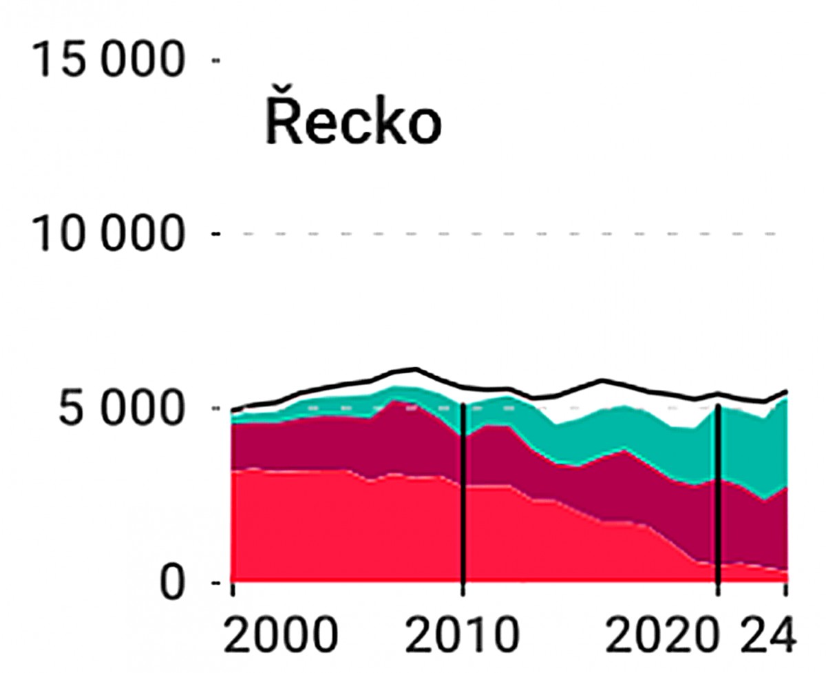Řecko výrazně omezilo uhlí a zvýšilo podíl obnovitelných zdrojů. Na konci období je výroba mírně pod spotřebou