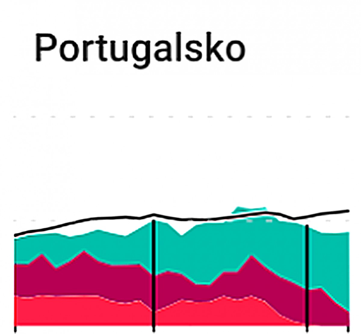 Portugalsko výrazně omezilo uhlí a rychle zvýšilo podíl obnovitelných zdrojů. Na konci období je výroba zhruba na úrovni spotřeby