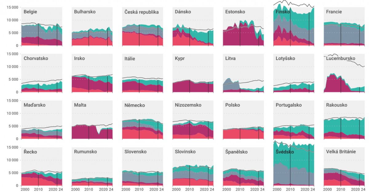 Vývoj vyrobené elektřiny na osobu podle jednotlivých zdrojů v letech 2000–2024 a srovnání se spotřebou pro členské státy Evropské unie a Velkou Británii. Hodnoty jsou uváděné v kWh na osobu za rok.