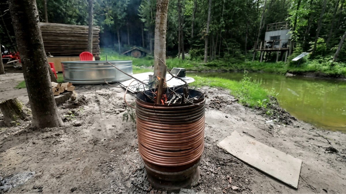 Konce měděné spirály propojte hadicemi s bazénem. Studená voda proudí do spirály k ohni, zahřívá se a vrací zpět jako teplá