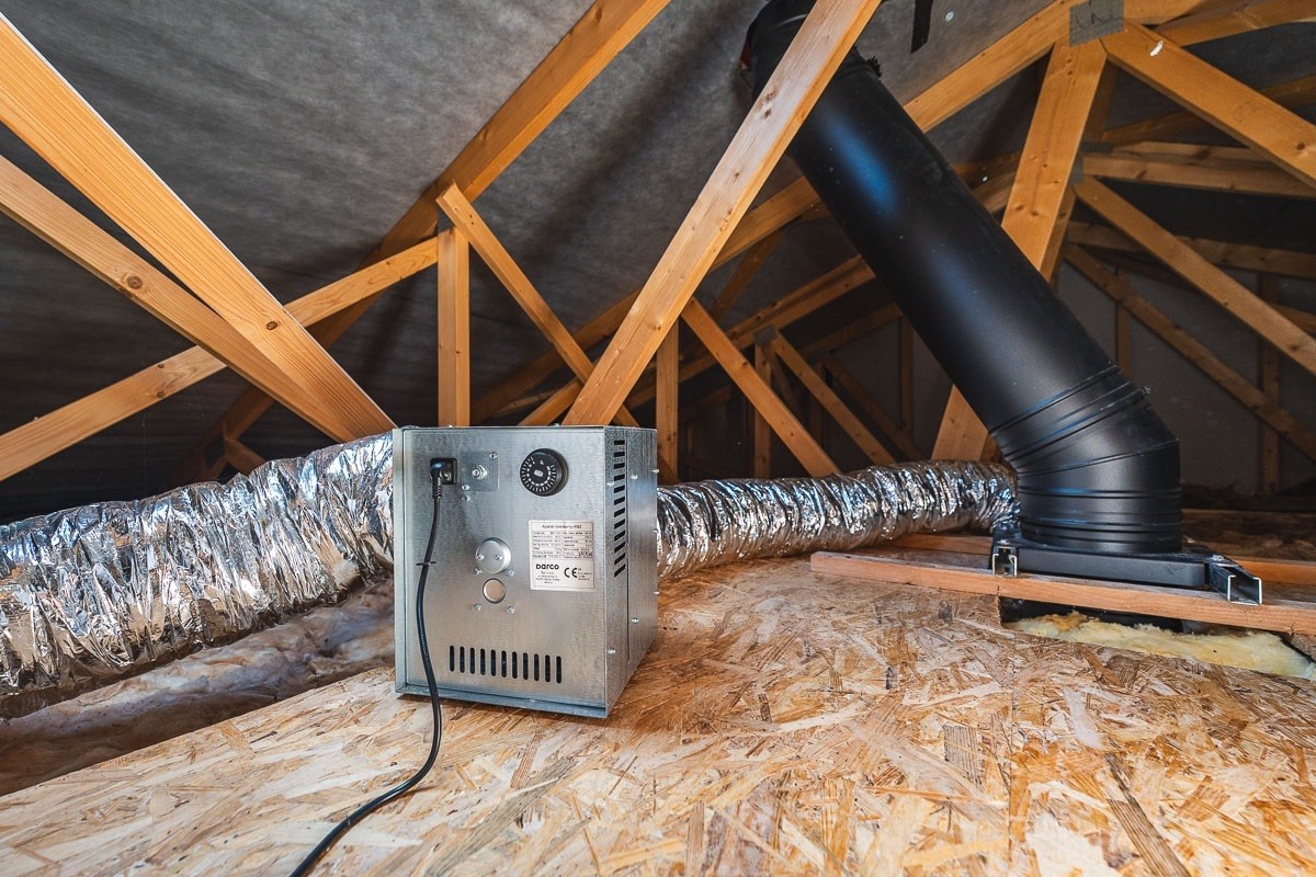 Na půdě je v potrubí větrák, který spíná podle toho, jakou teplotu si nastavíte. Je to stejné vedení jako u rekuperace