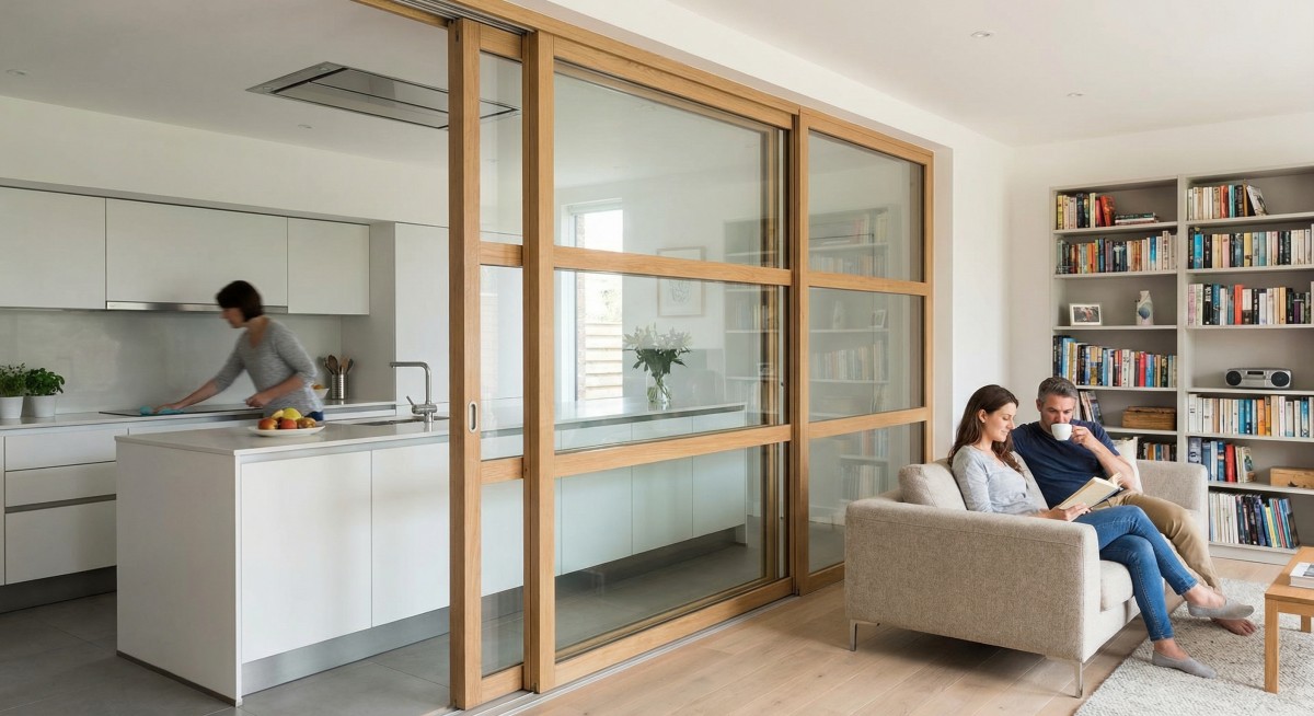 Posuvné prosklené stěny nabízejí ideální kompromis mezi otevřeností a soukromím. Když je potřeba, hluk i pachy z kuchyně zůstanou oddělené od zbytku prostoru