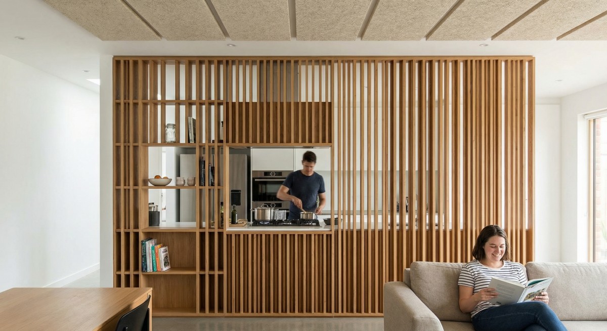 Lehké příčky nebo lamely dokážou prostor opticky rozdělit, aniž by ho úplně uzavřely. Pomáhají tak omezit hluk i vizuální chaos, ale zachovávají pocit otevřenosti