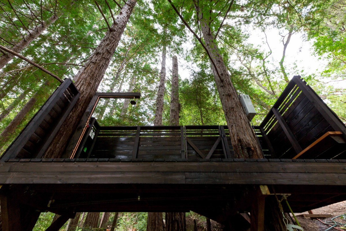 Konstrukce podepřená kmeny nabízí stabilní platformu s integrovaným rozvodem vody a venkovní sprchou určenou pro každodenní provoz v lesním prostředí