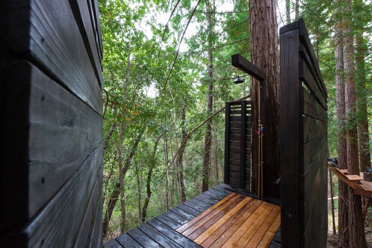 Konstrukce podepřená kmeny nabízí stabilní platformu s integrovaným rozvodem vody a venkovní sprchou určenou pro každodenní provoz v lesním prostředí