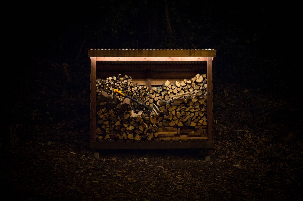 Úhledně poskládané špalky, připravená sekera a ticho lesa kolem — drobný, ale důležitý kout, který dává místu pocit domova i uprostřed přírody