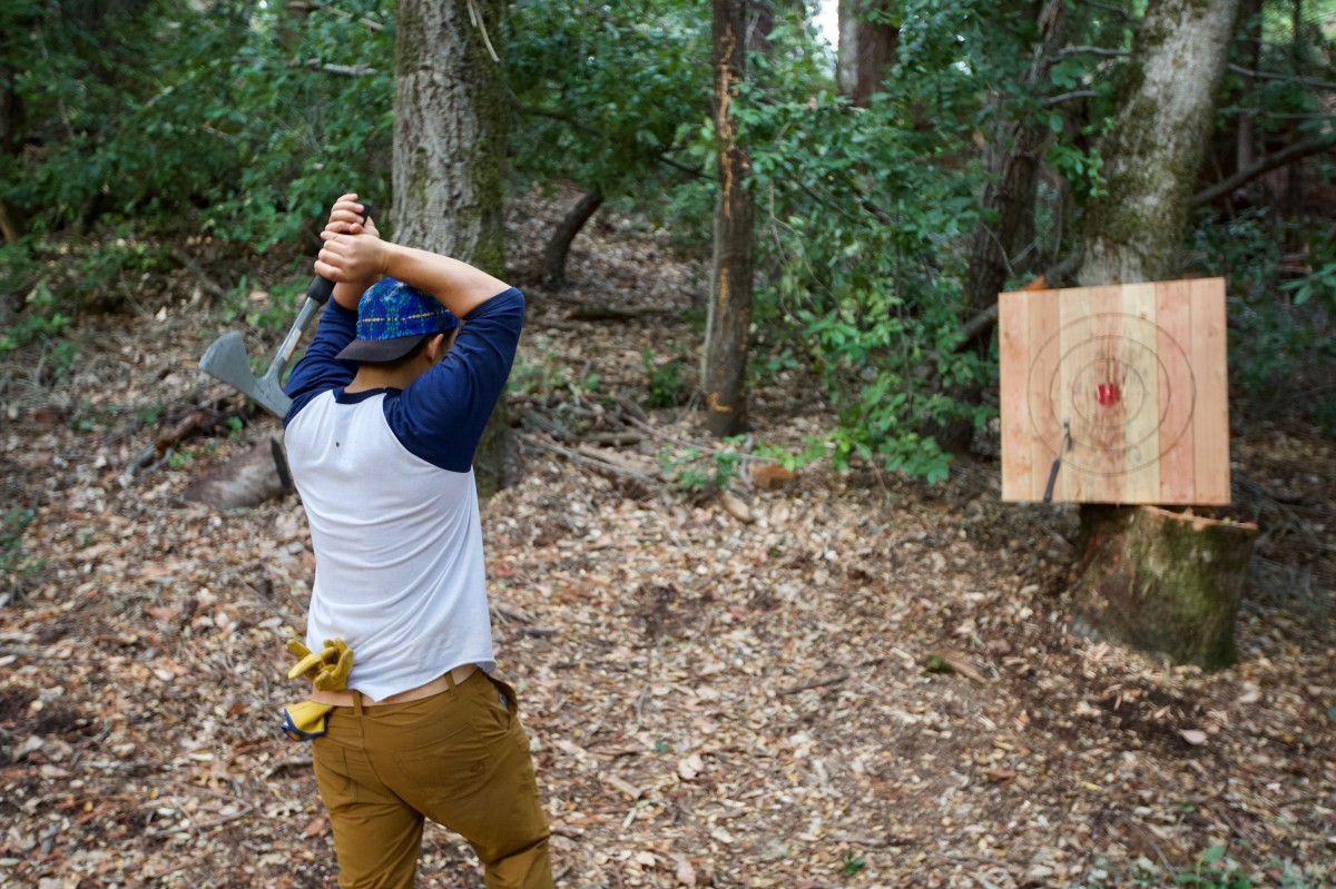 Chvíle soustředění v lesním koutě určeném pro vrhání sekery. Jednoduchý terč připevněný ke stromu a čistá radost z dovednosti, která k pobytu v přírodě jednoduše patří