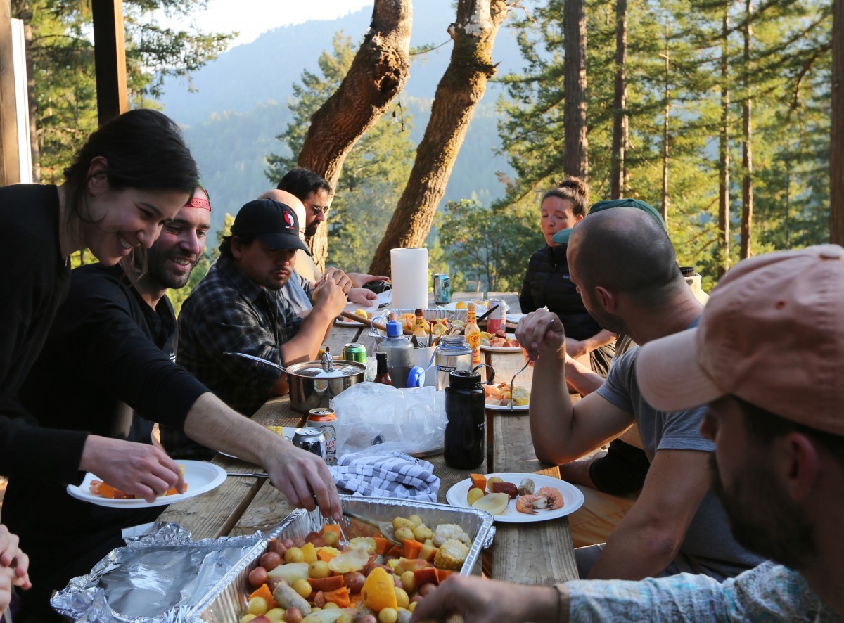Skupina usedá u stolu a servíruje si jednoduché pokrmy po dlouhém dni práce v terénu s výhledem na okolní lesy.