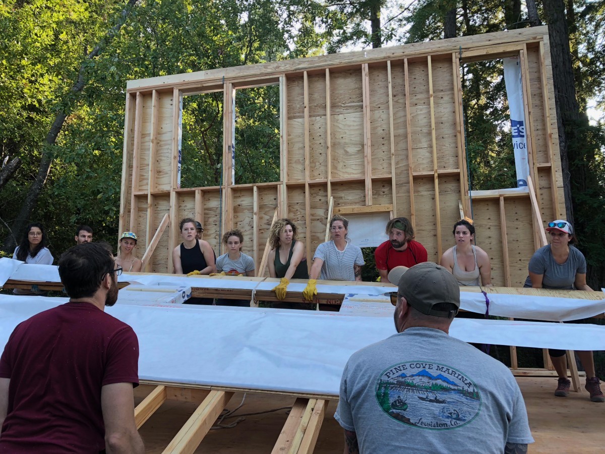 Společnými silami. Přátelé pomáhají při zvedání první stěny budoucí chaty. Atmosféra plná energie, soustředění a radosti z toho, že se společný sen začíná měnit ve skutečnost