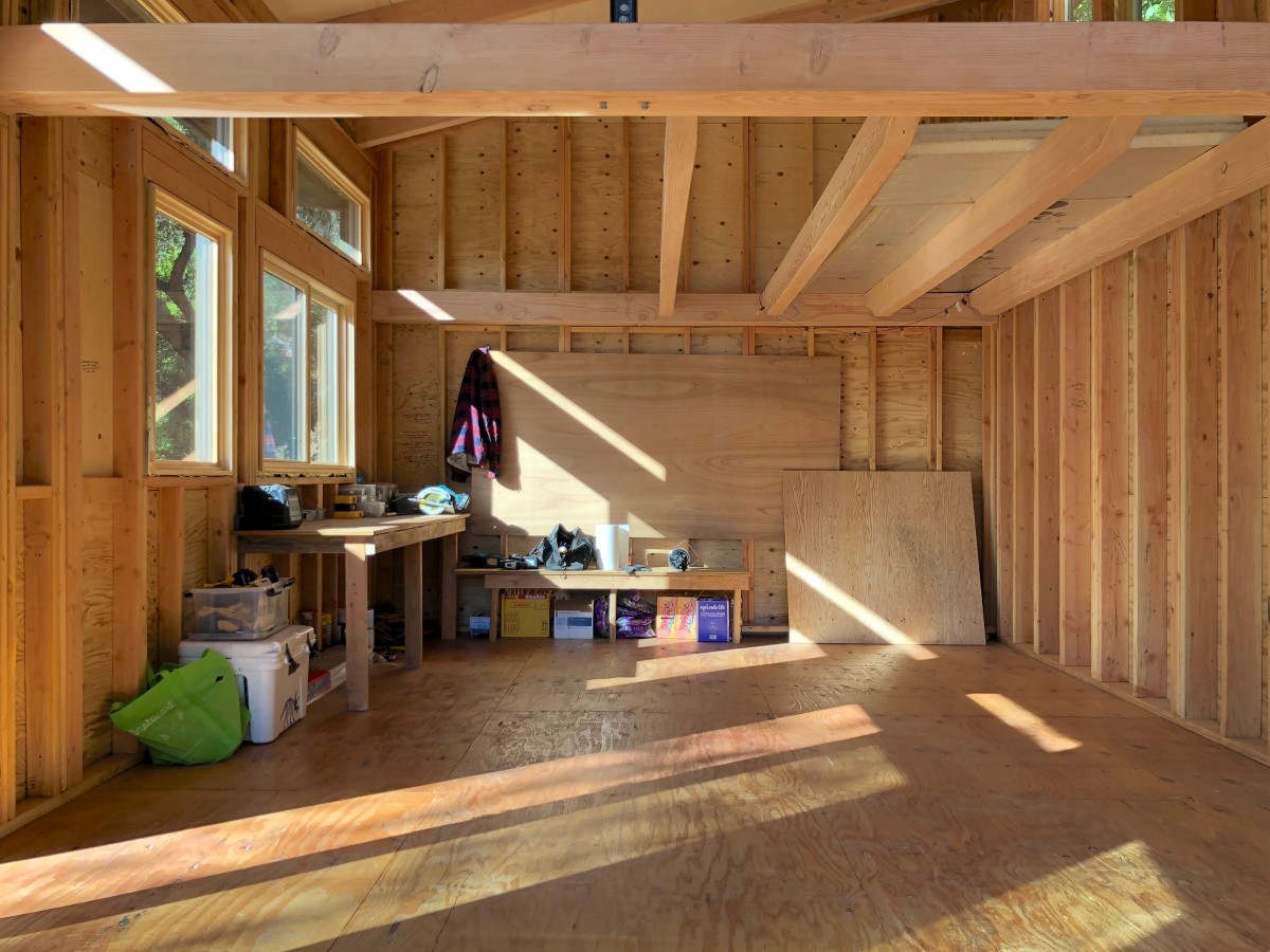 Interiér ve fázi hrubé stavby konstrukce je kompletně opláštěná a budoucí místnost už slouží jako provizorní dílna se stolem úložnými boxy a materiálem připraveným na další montáž
