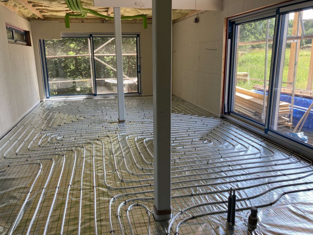 Dřevostavbu vytápí tepelným čerpadlem vzduch-voda a teplovodním podlahovým topením. Jako záložní zdroj mají baterie fotovoltaiky