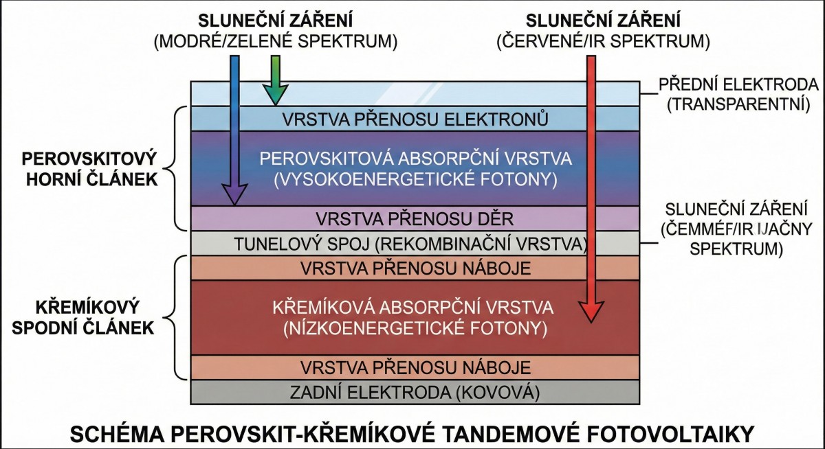Klasickým solárním panelům dochází dech, protože narážejí na takzvaný Shockley-Queisserův limit. Nedokážou zpracovat fotony s vyšší energií z modrého a zeleného spektra slunečního světla a tuto energii ztrácejí ve formě nevyužitelného tepla, které je pro fotovoltaiku škodlivé. Řešením, které mění globální energetiku, jsou perovskit-křemíkové tandemové články. Technologie využívá optický filtr. Na běžný křemíkový základ je nanesena mikroskopická vrstva krystalického perovskitu. Ten pohltí vysokoenergetické modré a zelené světlo, zatímco nízkoenergetické fotony propustí k vrstvě křemíku, který si nejlépe poradí s červeným a infračerveným zářením. Výsledkem je bezprecedentní nárůst výkonu.