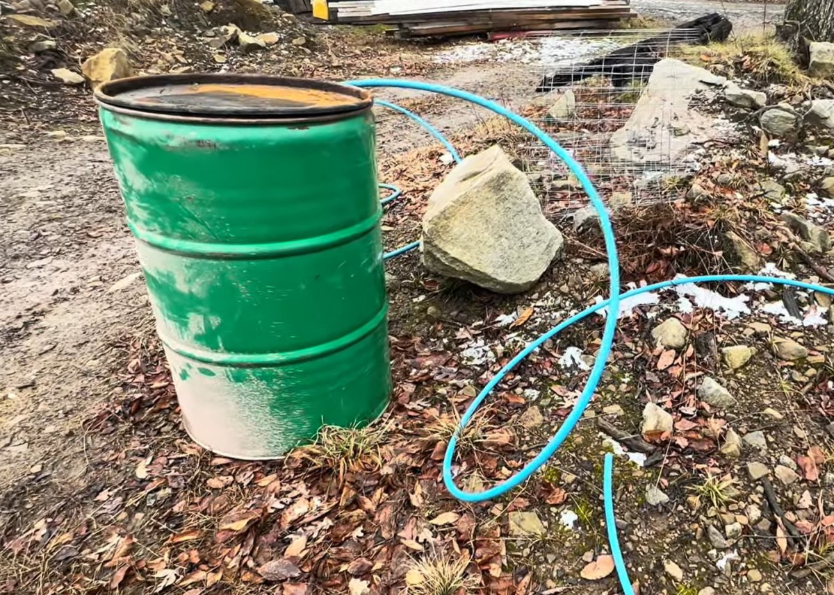 K výrobě pískové baterie stačil starý sud a hadice, které našel na zahradě