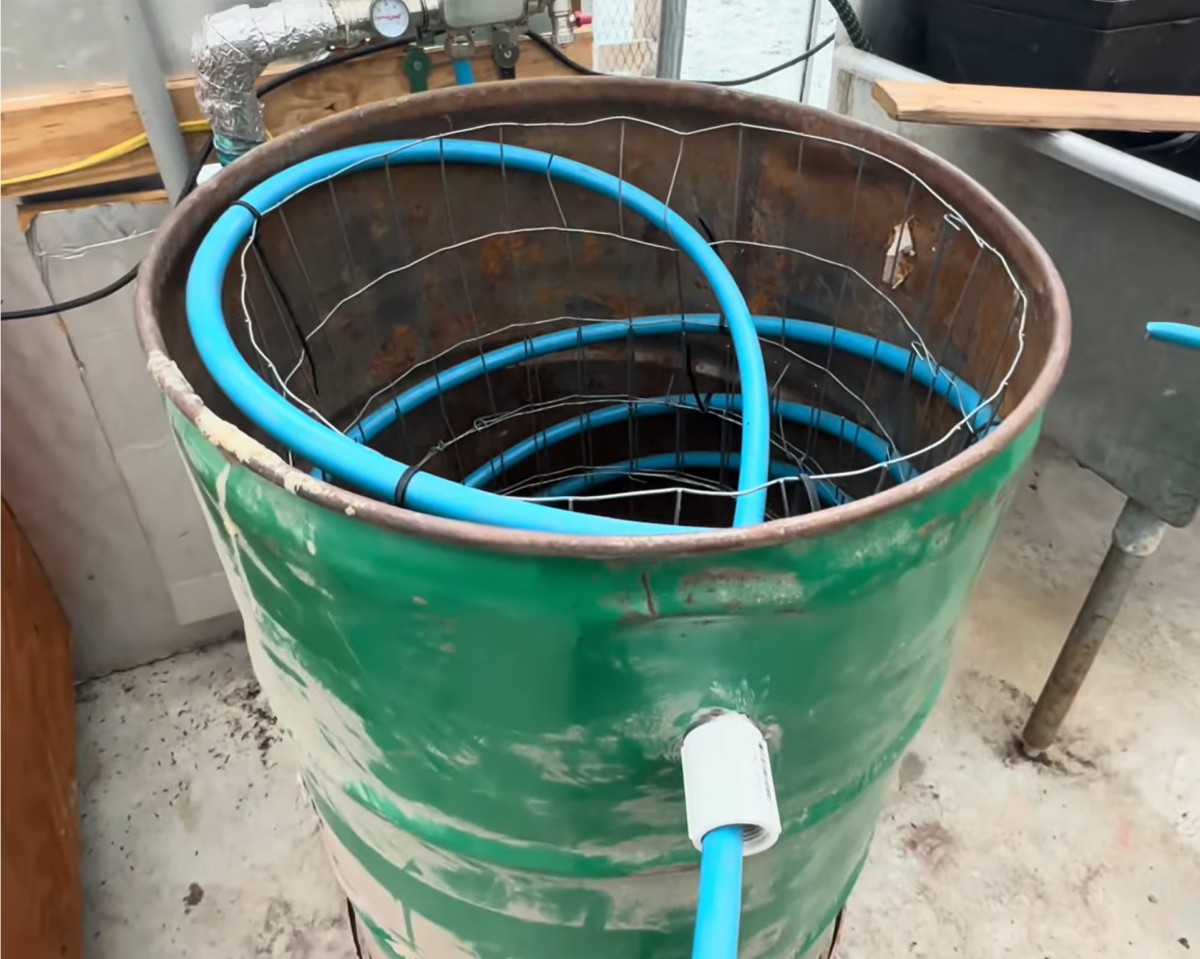 Hadici i s pletivem poté nainstaloval do starého sudu a hadici vyvedl ven otvorem