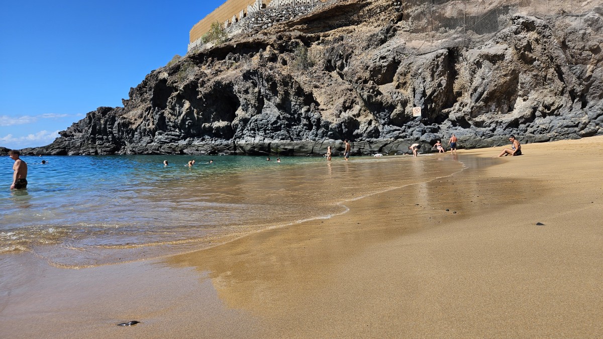 Čistá oceánská voda omývá jemný žlutý písek uzavřený mezi dva útesy