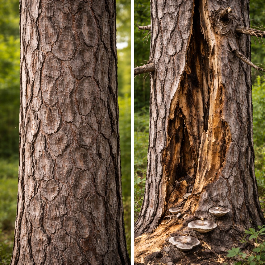 Zde můžete vidět detail dvou stromů. První z nich je zdravý a na jeho pokácení musíte mít povolení. Druhý je v havarijním stavu, můžete ho pokácet ihned, ale zpětně to doložit