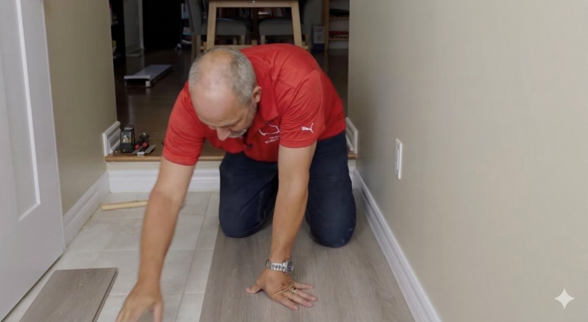 Vinylové lamely lze pokládat přímo na pevnou a rovnou keramickou dlažbu; začněte u nejdelší stěny místnosti a jednotlivé díly postupně zacvakávejte do zámků, aby vytvořily stabilní plovoucí podlahu