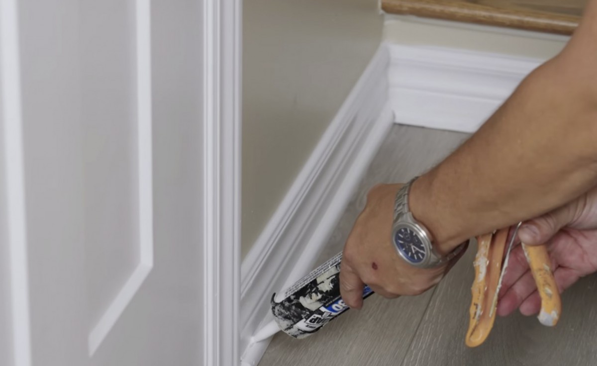 Spáru mezi lištou a stěnou na závěr vyplňte akrylátovým tmelem, který zakryje drobné mezery, zlepší vzhled detailu a lze jej po zaschnutí přetřít barvou