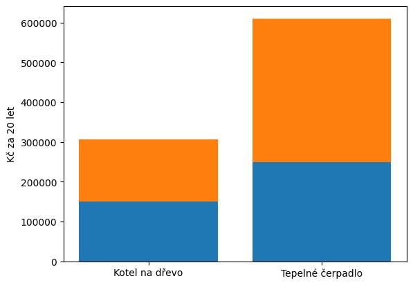 Kotel na dřevo vychází za 20 let zhruba na 306 tisíc Kč, zatímco tepelné čerpadlo přibližně na 610 tisíc Kč. Rozdíl tvoří hlavně vyšší provozní náklady čerpadla, které investici téměř zdvojnásobí