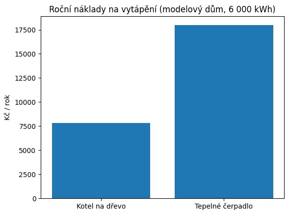 Roční náklady na vytápění dřevem vycházejí přibližně na 7 800 Kč, zatímco u tepelného čerpadla zhruba na 18 000 Kč. Provoz čerpadla je tak více než dvojnásobně dražší než vytápění dřevem