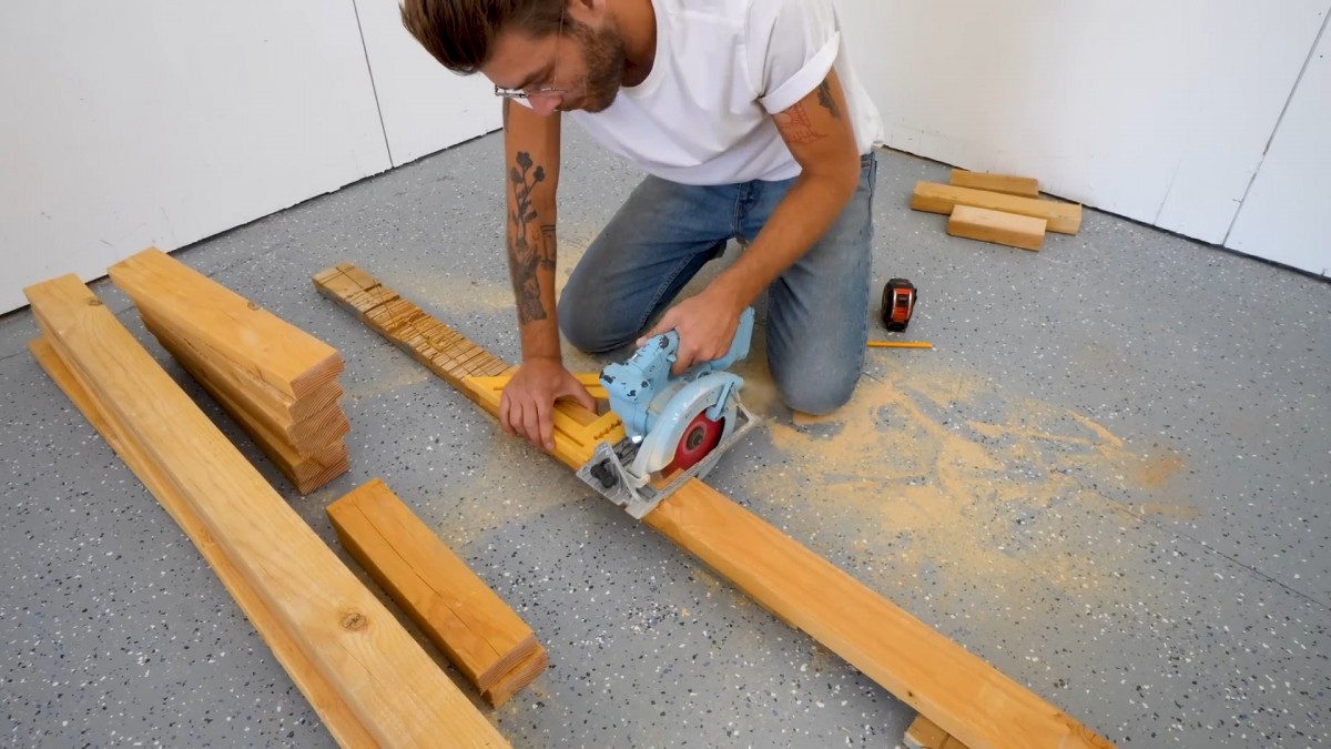 Řezání kratších dílů, které později poslouží jako vnitřní výztuhy konstrukce