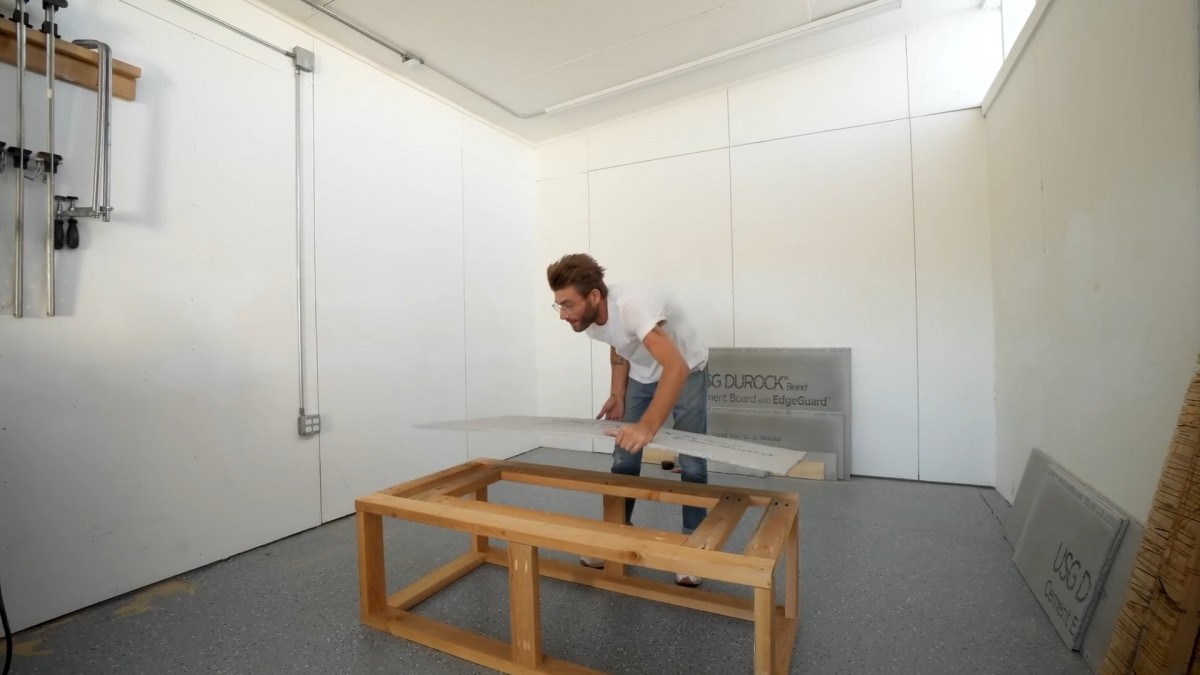 Horní deska se usazuje na rám, který nyní začíná připomínat hotový stolek